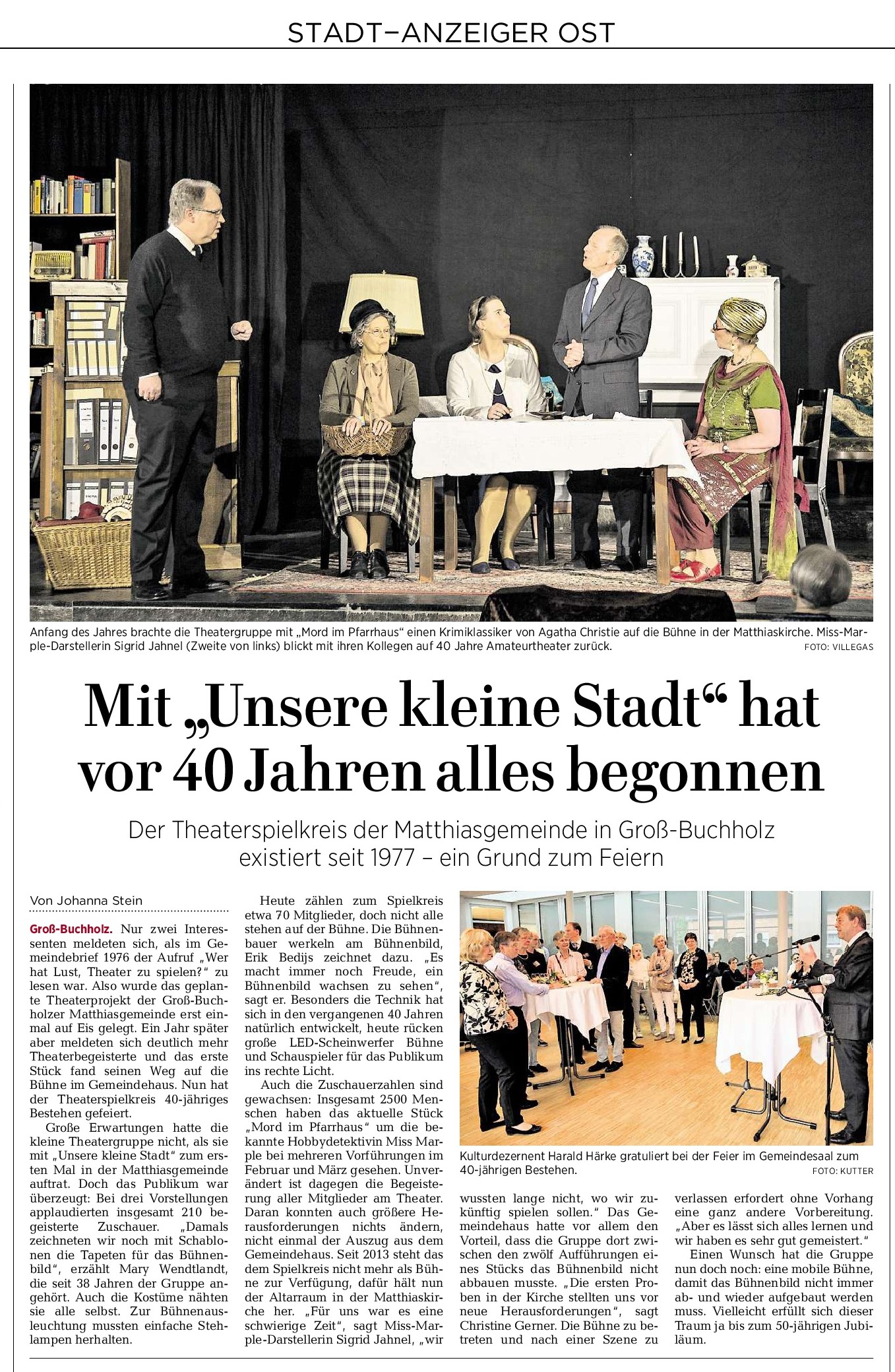 Nur zwei Interessenten meldeten sich, als im Gemeindebrief 1976 der Aufruf „Wer hat Lust, Theater zu spielen?“ zu lesen war. Also wurde das geplante Theaterprojekt der Groß-Buchholzer Matthiasgemeinde erst einmal auf Eis gelegt. Ein Jahr später aber meldeten sich deutlich mehr Theaterbegeisterte und das erste Stück fand seinen Weg auf die Bühne im Gemeindehaus. Nun hat der Theaterspielkreis 40-jähriges Bestehen gefeiert.